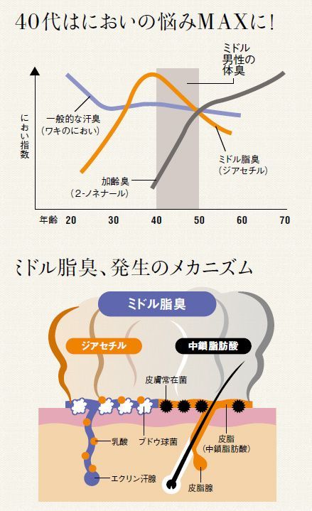 (図上)一般的な汗臭、ミドル脂臭、加齢臭の三臭が重なる40代は、生涯最も体臭要素の多い年代となる。(図下)ジアセチルは、汗に含まれる乳酸が頭皮などのブドウ球菌によって代謝・分解されて発生する。また、皮脂(中鎖脂肪酸)と混ざってミドル脂臭となり、においが増悪する。(※マンダム資料を基にプレジデント編集部作成)
