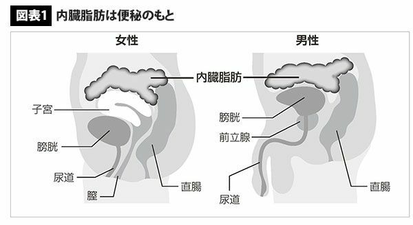 下腹部の断面図。向かって左側が腹、右が背中。内臓脂肪が増えると他の臓器を圧迫し、便秘や頻尿が引き起こされる。(図版提供=幻冬舎)