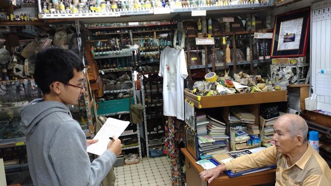 膨大な遺品を前に、国吉氏から収容についてヒアリングする筆者
