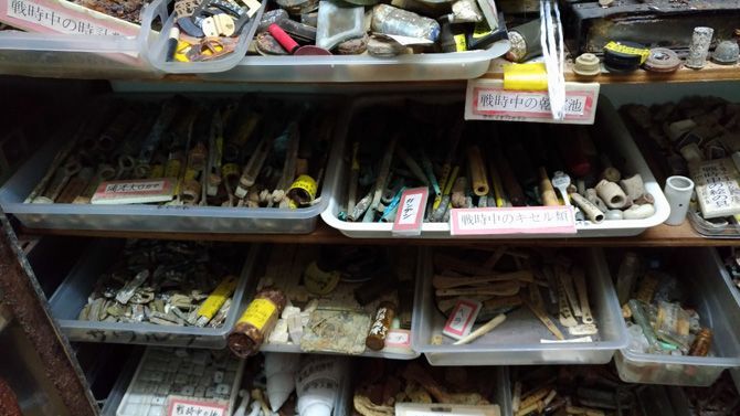 国吉氏の戦争資料館の一角、民間人の遺品が多数保管されている。