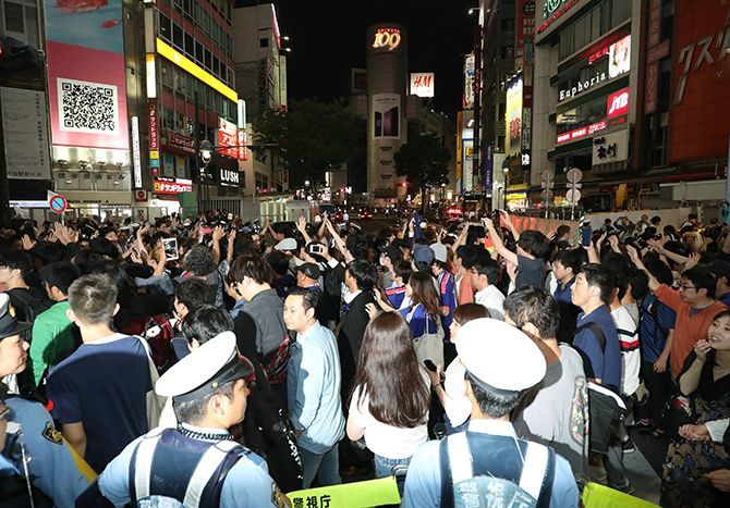 コロンビア戦終了後、混雑するスクランブル交差点でハイタッチするサポーターら=2018年6月19日、東京都渋谷区(写真=時事通信フォト)