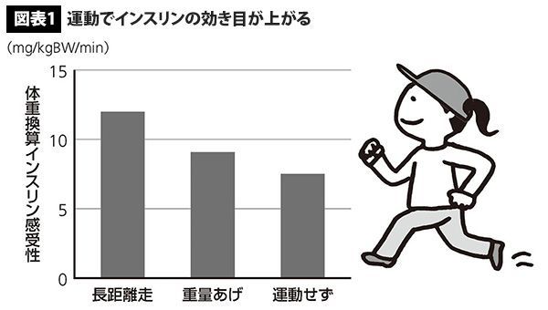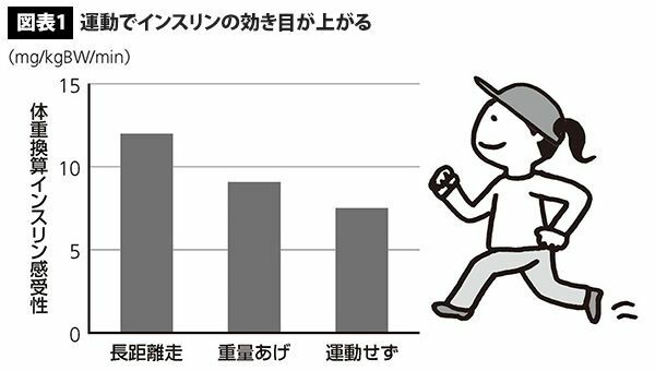 有酸素運動の長距離走ほどではないが、無酸素運動の重量挙でもインスリン感受性は高まる。(図版提供=幻冬舎 資料:「トレーニングの生化学」押田芳治『科学と生物』vol.35, No.8, 1997 イラストレーション=坂木浩子)