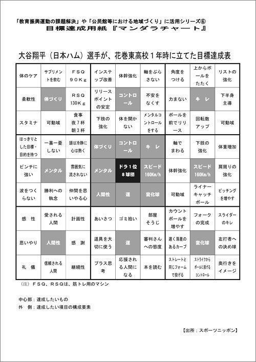 花巻東高校1年時に大谷選手が掲げた大目標「8球団にドラフト1位指名される」ために必要なことのひとつとして「運」をあげ、そのために、「ゴミ拾い」「部屋掃除」など実践することをあげている。出典:「岩手県生涯学習情報提供システム まなびネットいわて」。