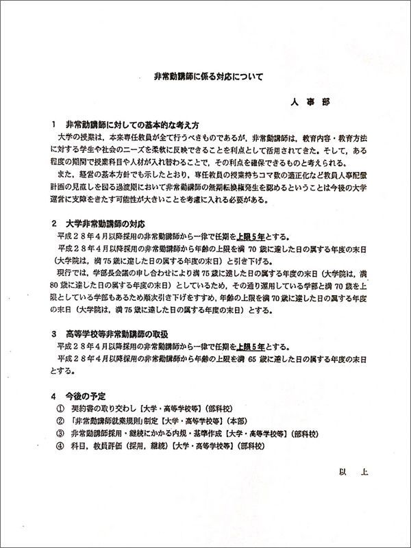 2015年11月に日大理事会で決定した文書「非常勤講師に係る対応について」
