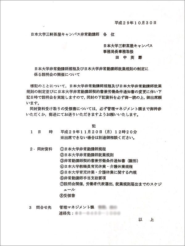 三軒茶屋キャンパスの非常勤講師にあてられた「説明会開催」のお知らせ。「事務局長事務取扱」として田中理事長の名前が書かれている。