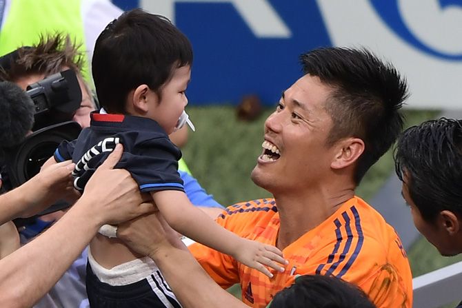 決勝トーナメント進出を決め、息子を抱き上げるゴールキーパーの川島永嗣選手(写真=AFP/時事通信フォト)