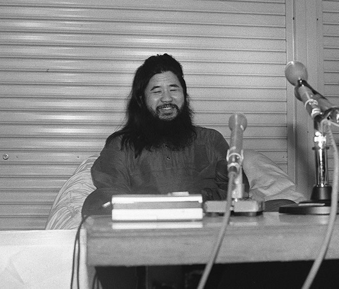 1990年、教団総本部などの捜索を受けて記者会見するオウム真理教代表(当時)の麻原彰晃(本名=松本智津夫)死刑囚(写真=時事通信フォト)
