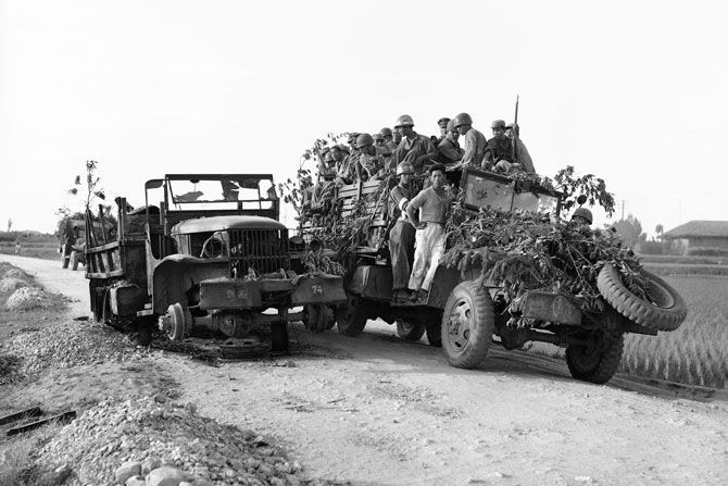 北朝鮮軍の猛攻に韓国軍は崩壊した――北朝鮮軍機の機銃掃射で破壊された友軍のトラックを横目に、後退する韓国軍の兵士たち(1950年7月9日。写真=AP/アフロ)