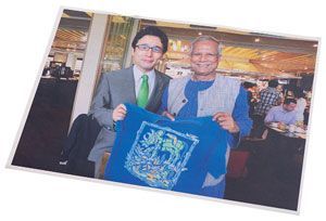 出雲社長が心の師と崇めるムハマド・ユヌスさんとの2ショット写真。いつも持ち歩き、味方を増やすために恥をかくのが辛くなったとき、何度も見返すのだという。