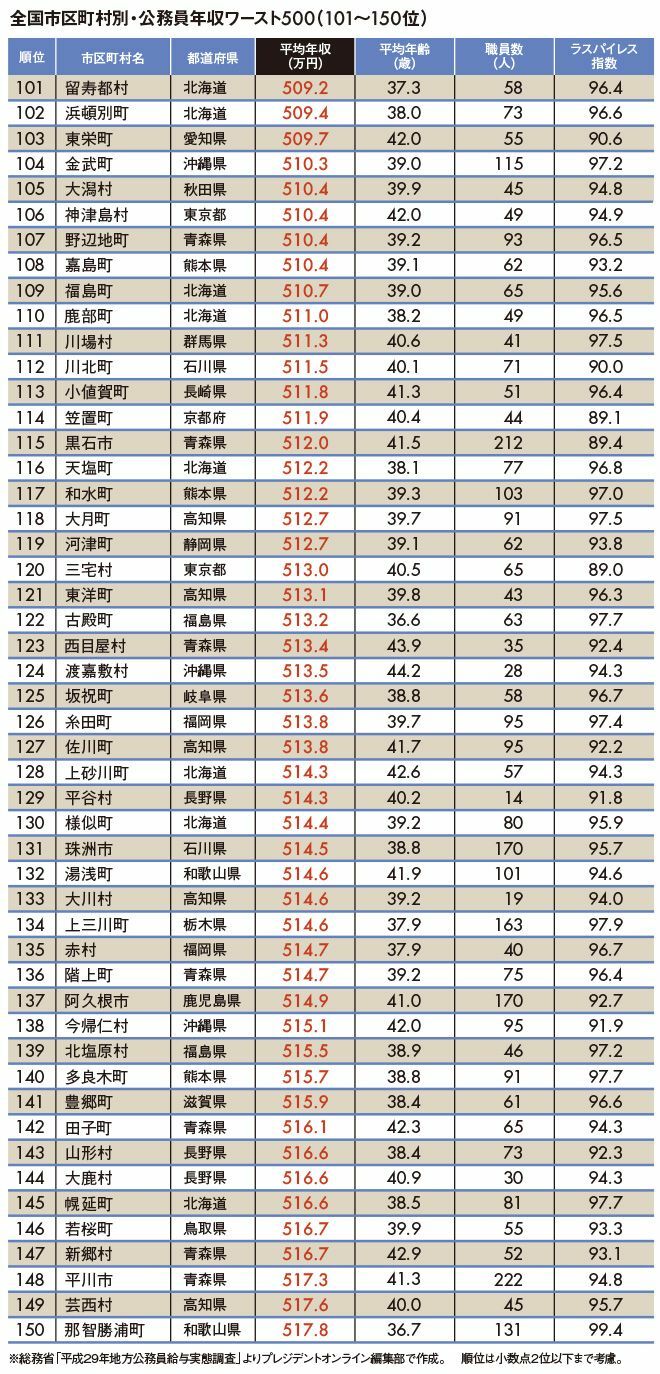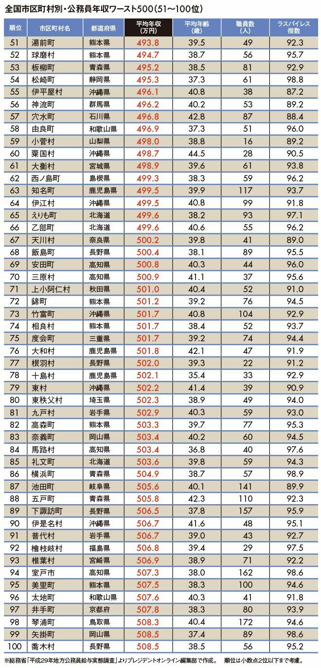 地方公務員年収ランキングワースト500