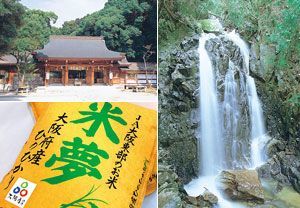 楠木正行を祭る四條畷神社(左上)。民話に登場する権現滝(右)。おいしいと評判の「まいむ」(左下)。