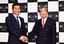 RIZAPグループの瀬戸健社長(左)は、松本晃氏を同グループCOOに迎え入れると発表(18年5月28日)。(AFLO=写真)