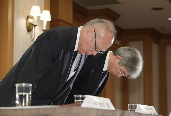 不正入試/謝罪する東京医科大の行岡常務理事ら 東京医科大の一般入試で不正に得点を操作した問題をめぐり、記者会見で謝罪する行岡哲男常務理事(左)ら=7日午後、東京都新宿区(写真=時事通信フォト)