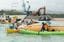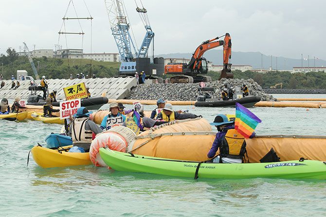 2018年4月25日、米軍普天間飛行場(沖縄県宜野湾市)の名護市辺野古移設に向けた護岸工事の着手から1年。工事に反対し、カヌーなどで抗議活動をする人たち(写真=時事通信フォト)
