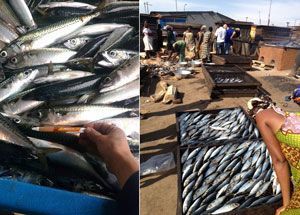 (左)アフリカに輸出される小さなサバ(右)ガーナに水揚げされ、燻製にされるサバ(写真提供=原亮一さん)