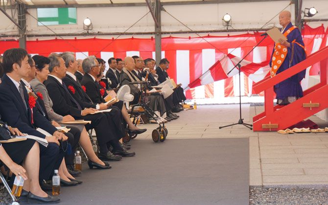 聖光寺の夏季大祭でトヨタ役員ら(左端から早川副会長、豊田社長、女性をはさんで4人目が内山田会長)に法話をする松久保秀胤住職(撮影=安井孝之)