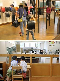 (上)ランドセルを試着して、ピースサインをとる子供もいた。/(下)工房の手前には子供が見学できるスペースも設けられている。
