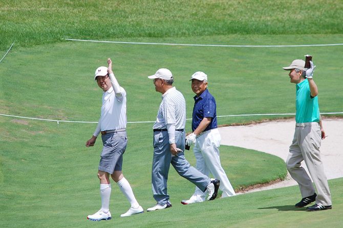 ゴルフを楽しむ安倍晋三首相(左端)。(右から)榊原定征経団連前会長、渡文明JXTGホールディングス名誉顧問、御手洗冨士夫経団連名誉会長=8月19日、山梨県富士河口湖町(写真=時事通信フォト)