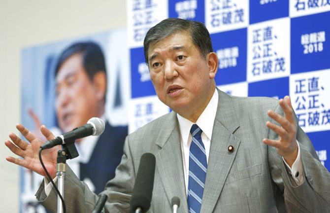 自民党総裁選挙に向け、記者会見で憲法改正について持論を述べる石破茂元幹事長=8月17日、東京・永田町(写真=時事通信フォト)