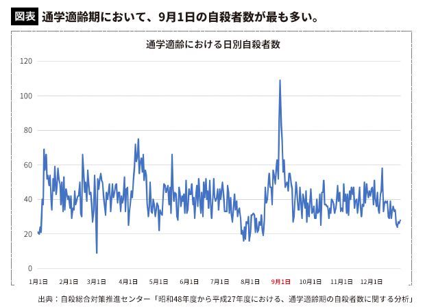 通学適齢期の「日別自殺者数」では、9月1日が最も多かった。