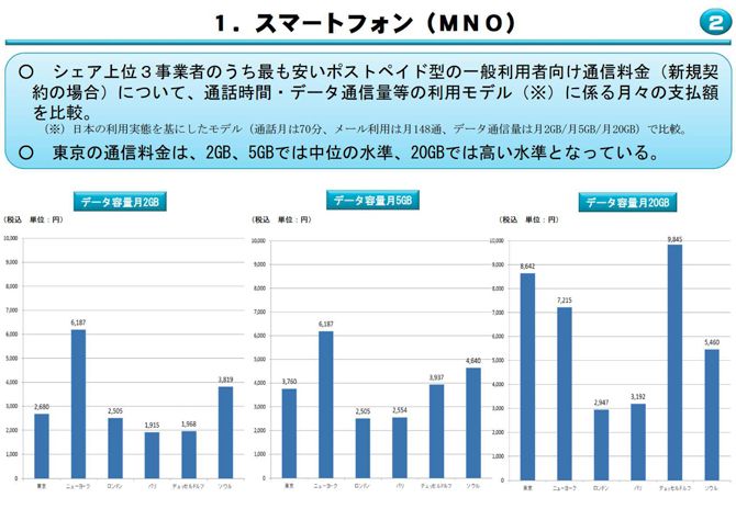 世界主要都市のスマートフォン(MNO)の通信料金(総務省「電気通信サービスに係る肉外価格差調査 平成28年度調査結果(概要)」より)