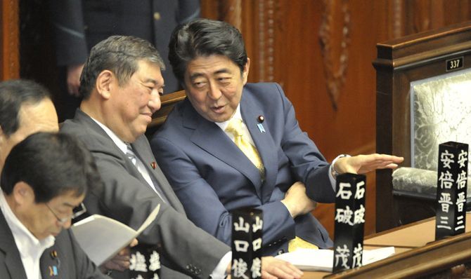 衆院本会議場で、石破茂地方創生担当相(当時)と話す安倍晋三首相(2015年07月16日、東京・国会内)(写真=時事通信フォト)