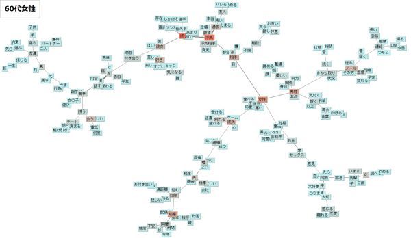 「オウケイウェイヴ」投稿から抽出した、60代女性の「恋の悩み」頻出ワード関連性マップ(オウケイウェイヴ作成/クリックして拡大)