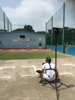 簡易型弾道測定器「Rapsodo(ラプソード)」を導入した(捕手の後ろの装置)。(写真=清水岳志)