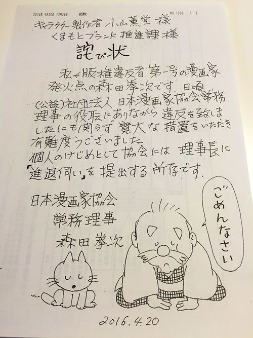 森田拳次氏から送られた実際の「詫び状」(画像提供=チームくまモン)