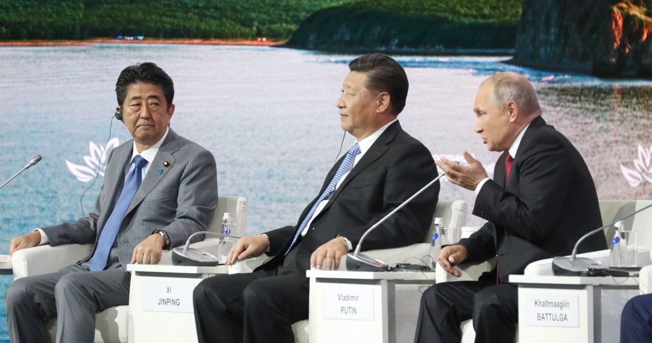 2018年9月12日、ロシア・ウラジオストクでの東方経済フォーラムの全体会合で話す(左から)安倍晋三首相、中国の習近平国家主席、ロシアのウラジーミル・プーチン大統領(写真=時事通信フォト)