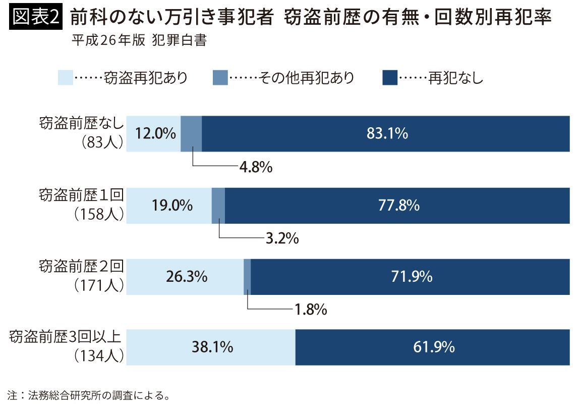 前科のない万引き事犯者 窃盗前歴の有無・回数別再犯率(2014年度版犯罪白書より)