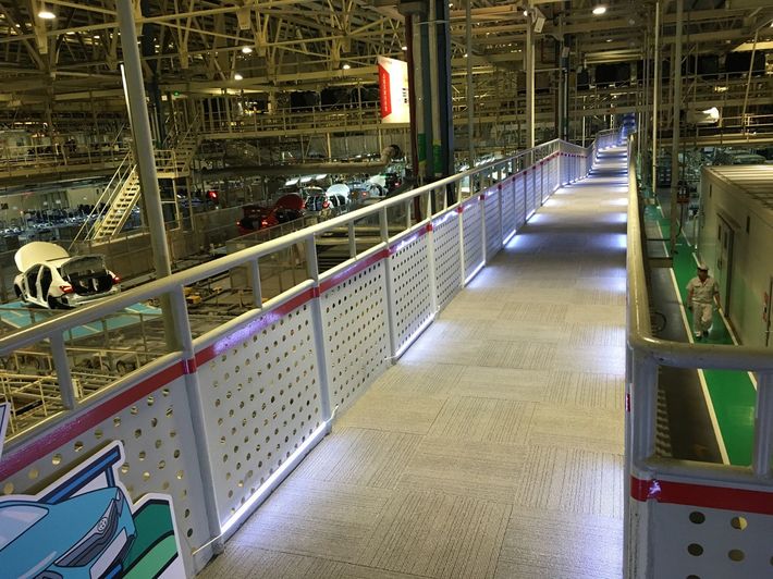 広汽トヨタ自動車の見学路の様子。足元がライトアップされているのがわかる。