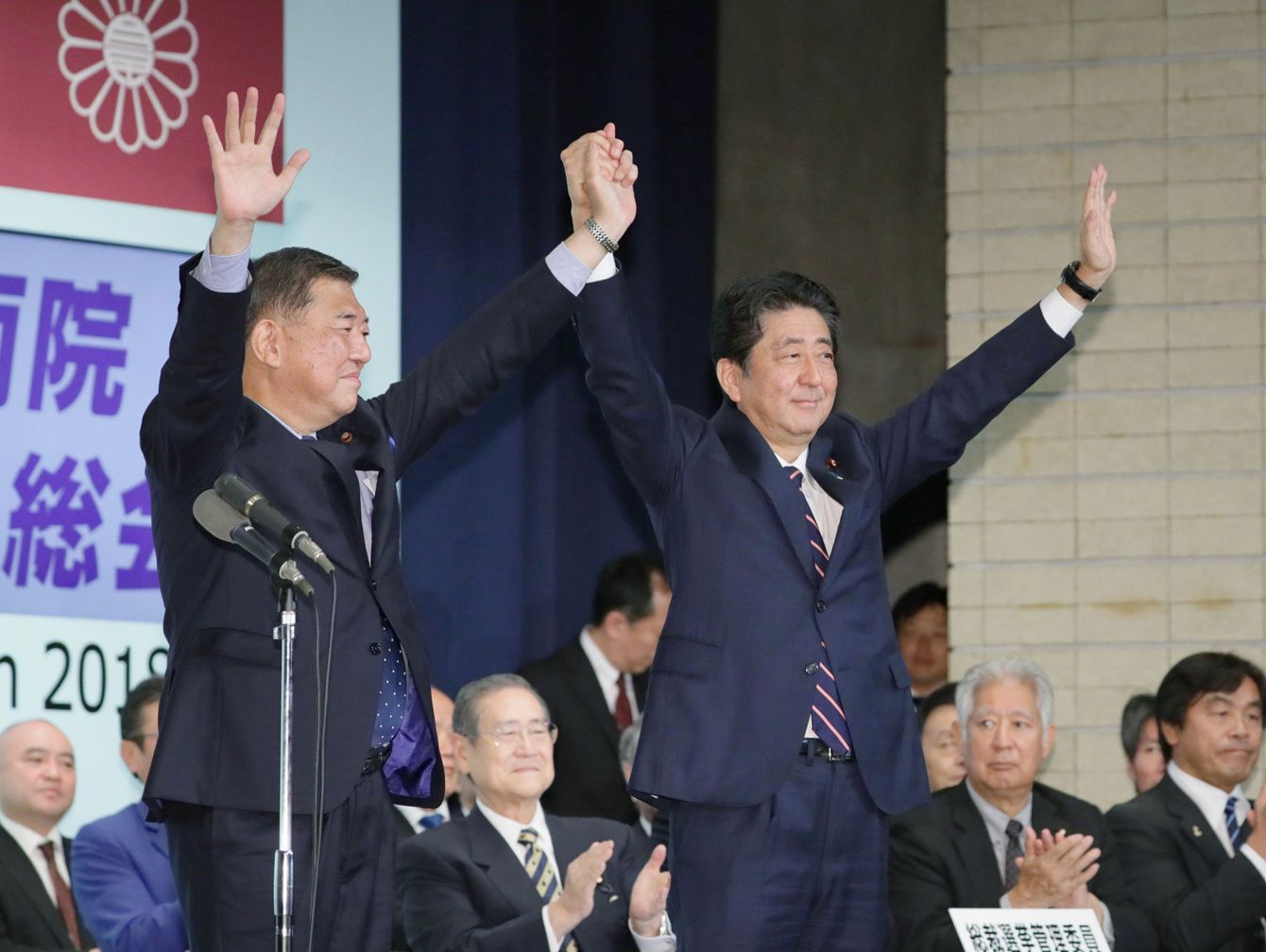 2018年9月20日、自民党総裁選挙を終え、手を取り合う安倍晋三首相と石破茂元幹事長(写真=時事通信フォト)