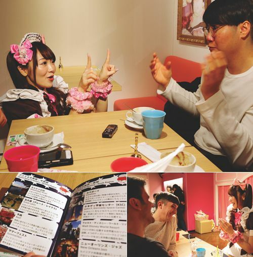 メイドカフェ初体験の韓国男性(上)とロンドンから来た2人組の男性(右下)。全メイドに配布する英会話ハンドブック(左下)。各国の名物や、「おかえりなさい、ご主人様」など、店でよく使う言葉が英語で書かれている。