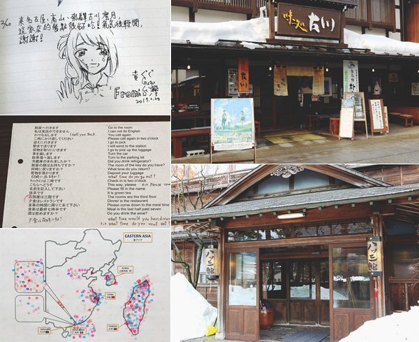 味処 古川(右上)では、『君の名は。』の聖地巡礼者に対しノートを用意。コメントから客の国名がわかる(左上)。ハツ三館(右下)の仲居さんの英語虎の巻(左中)。観光案内所では訪問者に自国の上にスタンプを押してもらっている。マーケティングにも役立つ(左下)。