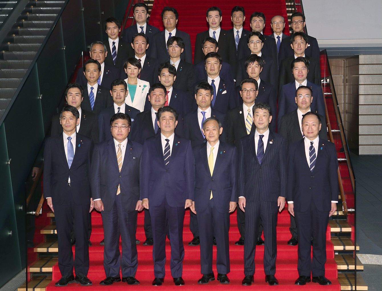 安倍晋三首相(左から3人目)と記念撮影する第4次安倍改造内閣の政務官ら=2018年10月4日、首相官邸(写真=時事通信フォト)