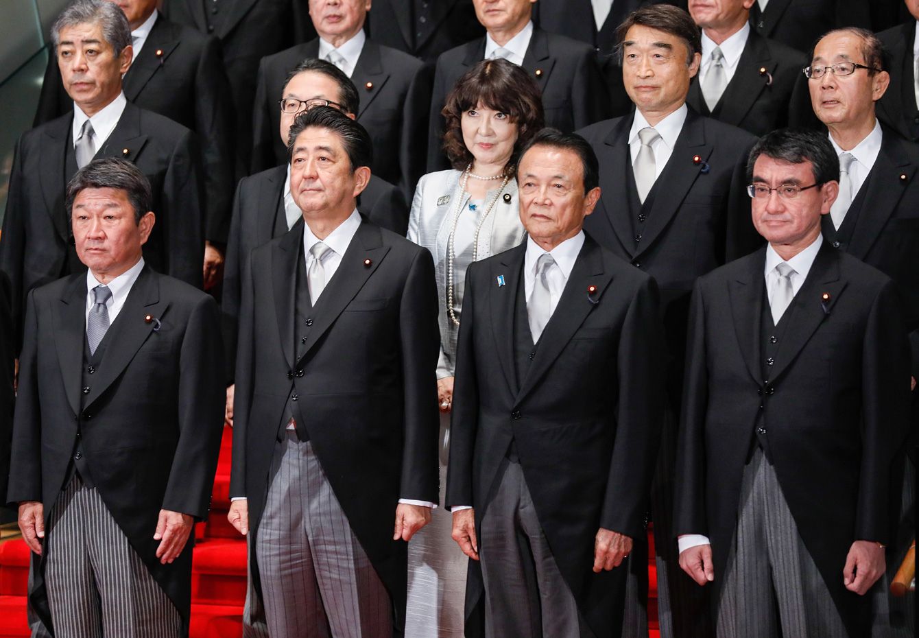 2018年10月2日、初閣議を終え、記念撮影に臨む第4次安倍改造内閣の閣僚ら(写真=EPA/時事通信フォト)