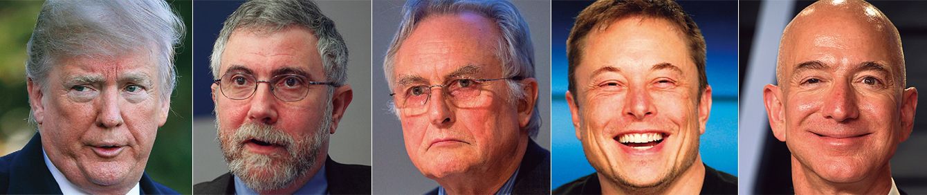 (写真左から)トランプ大統領、経済学者 ポール・クルーグマン氏、イギリスの生物学者。『利己的な遺伝子』著者 リチャード・ドーキンス氏、テスラ、スペースX社の共同創設者 イーロン・マスク氏、Amazon共同創設者 ジェフ・ベゾス氏(AFLO=写真)