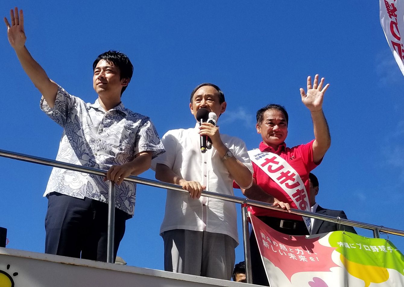 2018年9月16日、街頭演説で、縄県知事選挙候補者の佐喜真淳氏と並ぶ小泉進次郎氏と菅義偉官房長官(写真=時事通信フォト)
