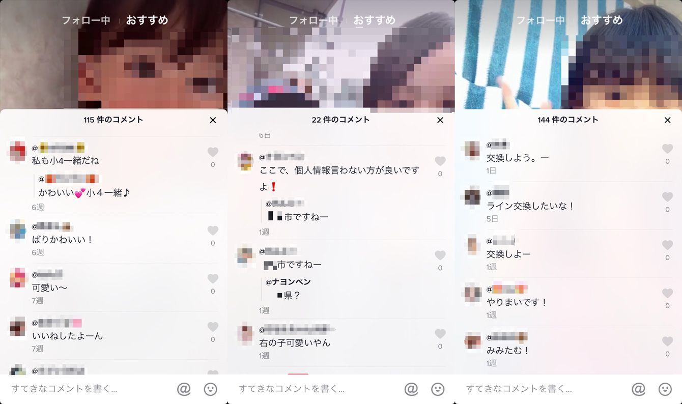 「TikTok」のスクリーンショット。小学生らしきユーザーの動画投稿に「かわいい」「ライン交換したい」といったコメントが付く。(画像の一部を加工しています)