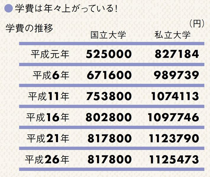 25年間の物価や平均年収の上昇率に比べると、学費の上昇率は高く、家計を圧迫している。