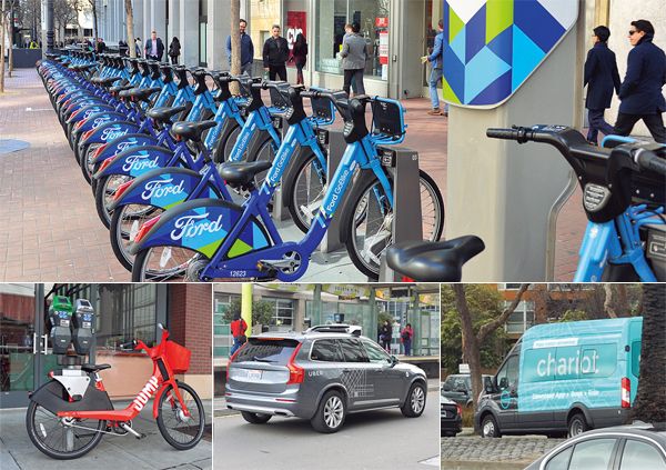新興企業との協業や買収で新サービスを拡大する欧米企業。フォードはMotivateと提携し、自転車シェアサービスの展開を進める(上)。また、通勤乗り合いバスのChariotも買収(下右)。Uberは「JUMP Bikes」を買収した(下左)。ボルボと自動運転の開発も進める(下中)。