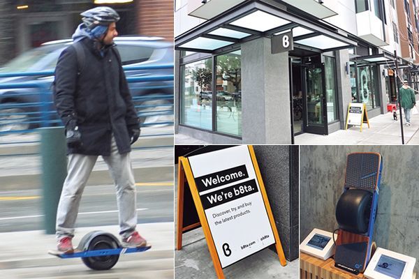 サンフランシスコにある最新ガジェットショップ「b8ta(ベータ)」。ベンチャー企業などがつくった商品が並ぶ。電動のスケートボードや、スマホと連動する電動歯ブラシ、手の動きに反応するスクリーンなど見たこともない商品に触れることができる。