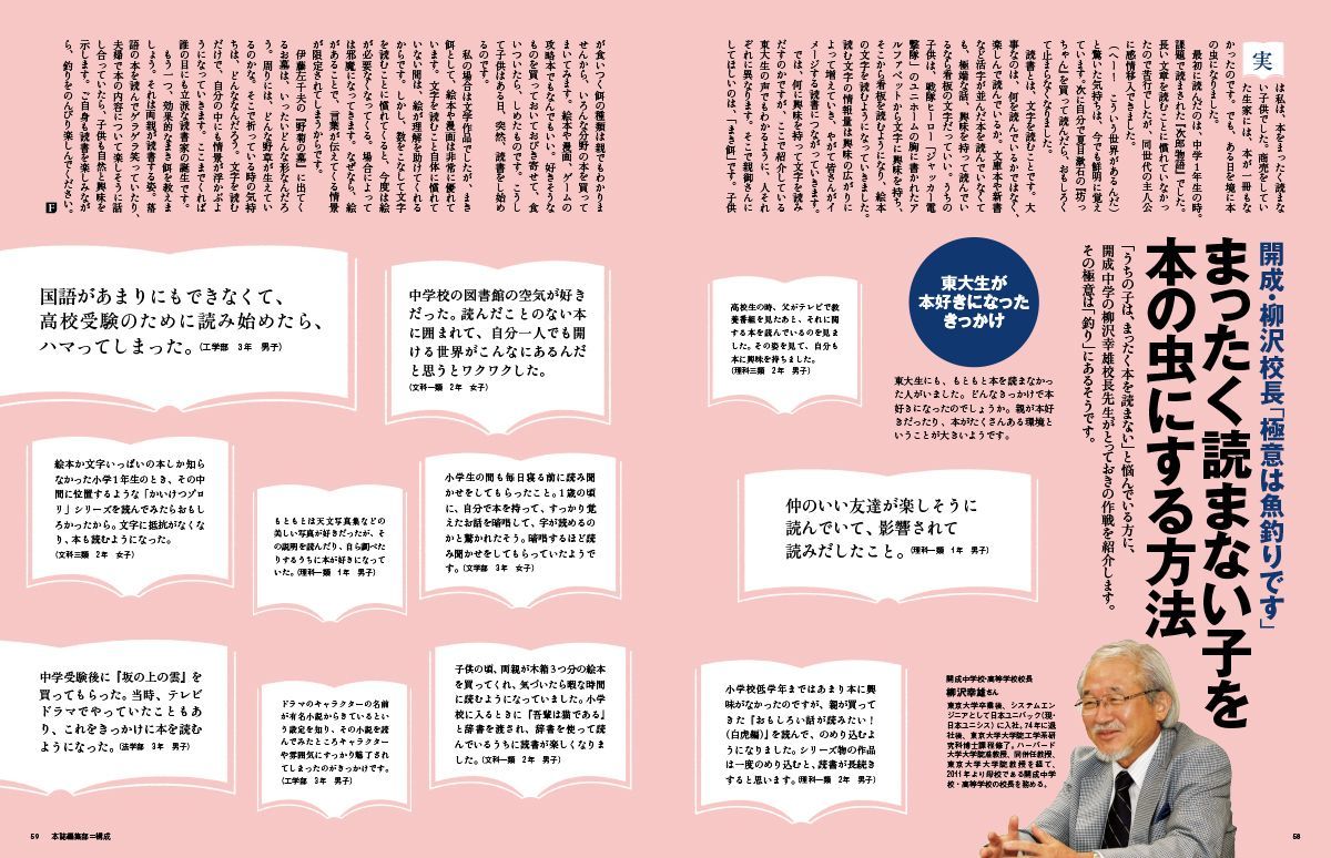 「子どもを本の虫にするには撒き餌が大事。親が子に与えるのは必ずしも真面目な小説でなくてもいい。子どもが好む漫画やゲーム攻略本でもいい」と語る開成高校・柳沢校長(『プレジデントFamily2018秋号』より)。