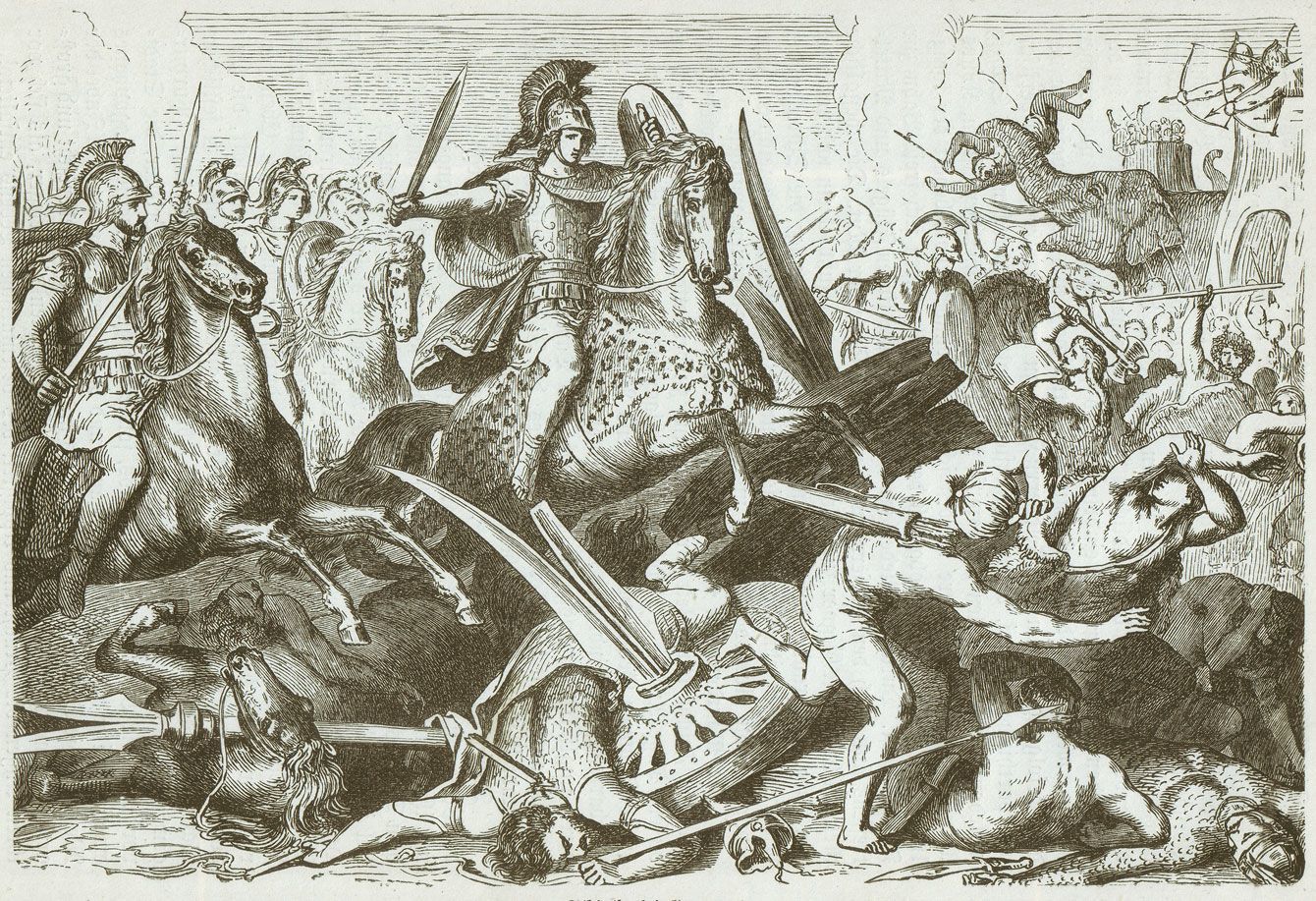「自分たちの歴史をこそ世界史にするのだという意志」――。紀元前331年10月1日、アレクサンドロスが率いるマケドニア軍がペルシア軍を破った「ガウガメラの戦い」を描いた版画(写真=iStock.com/ZU_09)
