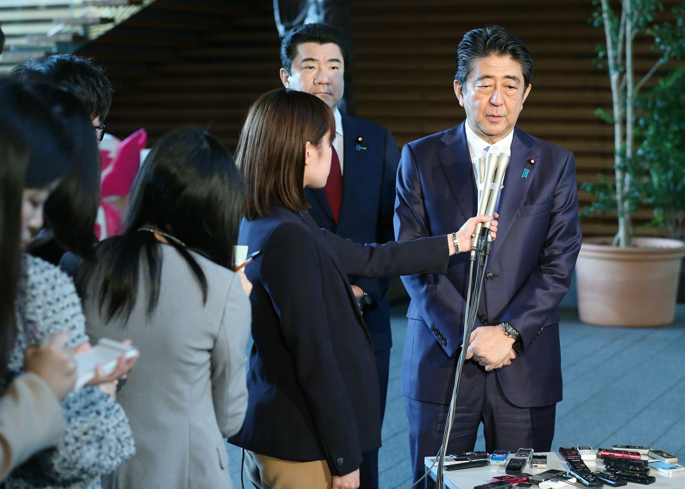 2018年10月16日、消費税率の引き上げを表明後、欧州外遊を前に報道陣の取材に応じる安倍晋三首相。(写真=時事通信フォト)