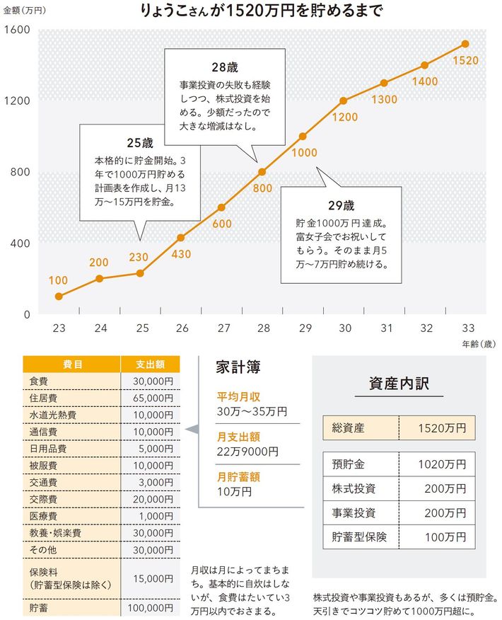 (写真左上から時計回りに)長財布は母親からのプレゼント。食費などの支出は、家計簿アプリ「家計簿Dr.Wallet」で管理。レシートをスキャンすると、データ化してくれる。収支と支出の分析ページも便利。富女子会で使っている、3年間で1000万円貯めるシート。