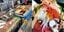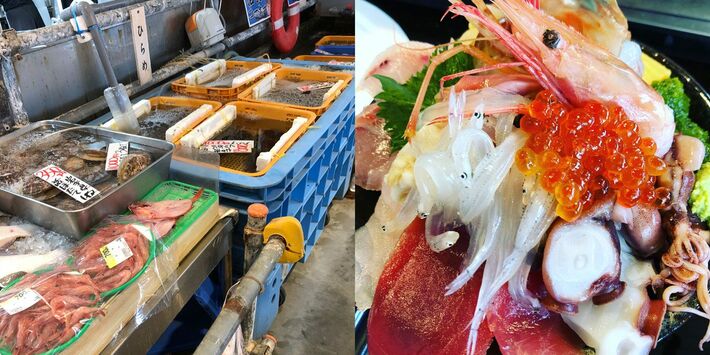(左)豊富な品ぞろえの七のや、(右)ボリューム満点の海鮮丼