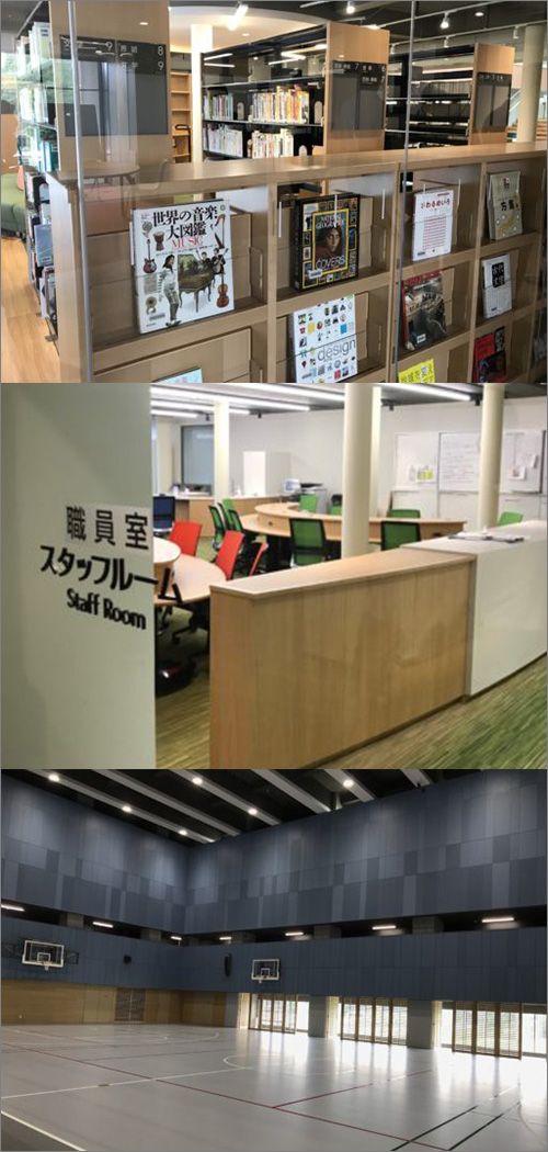 ドルトン東京学園の図書館、職員室、体育館(撮影=中本順也)