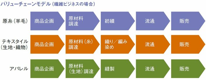 米国の経営学者マイケル・E・ポーターが提唱した理論。三星毛糸は「テキスタイル」が本業だが羊毛・アパレルまで事業を拡大している